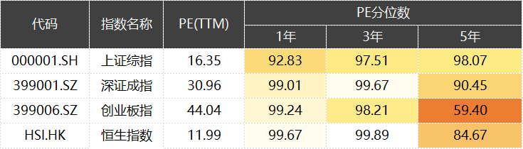 截至9月19日,上证综指/深证成指/创业板指/恒生指数的市盈率分别为16.35/30.96/44.04/11.99倍,分别处于三年的97.51/99.67/98.21/99.89分位,上周末收盘日估值分别16.57/30.68/42.93/11.95倍。